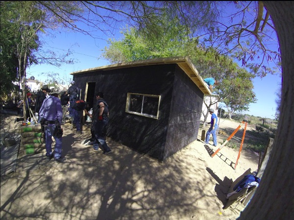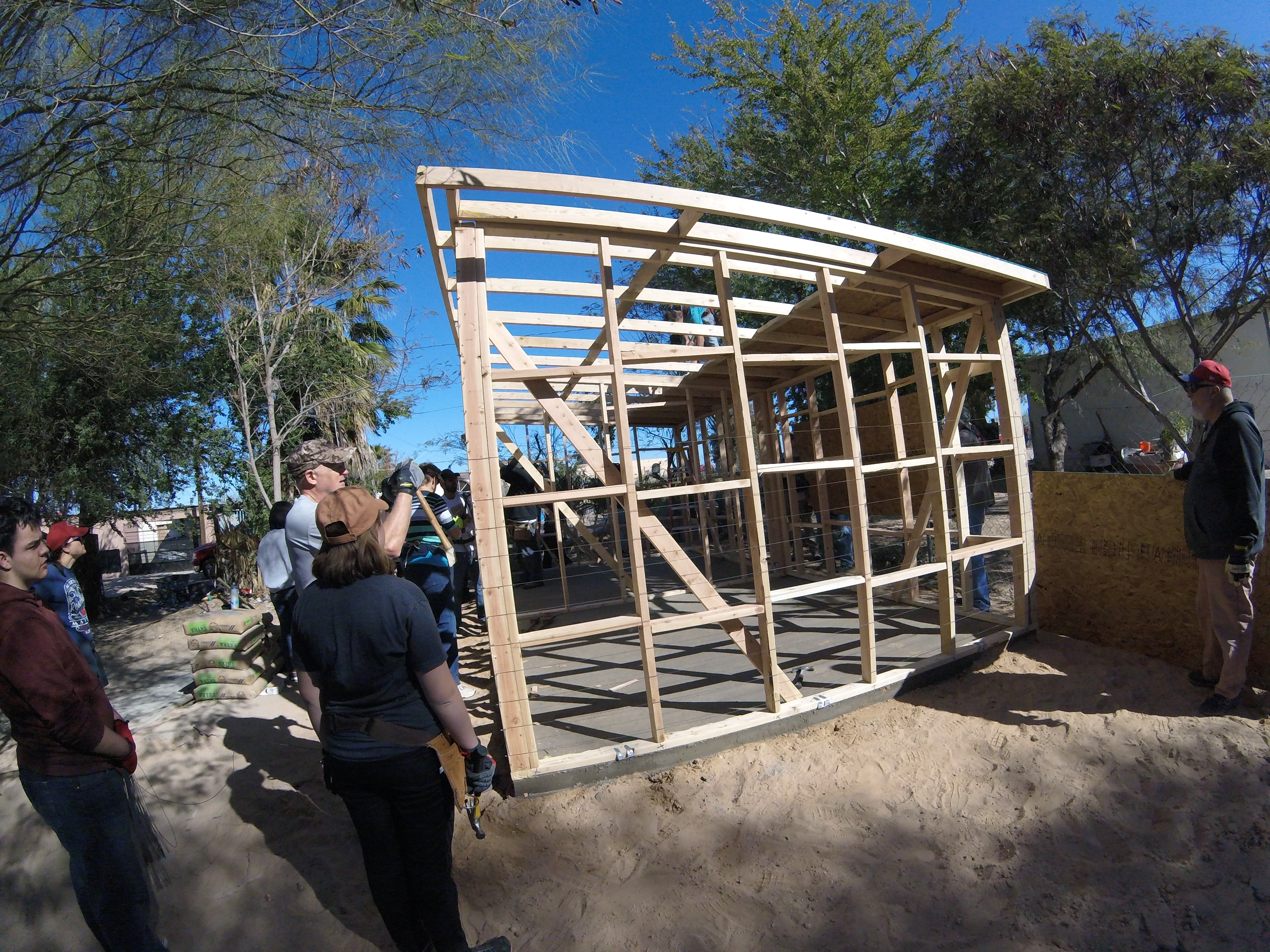 Day 3 is the long day on these builds. After breakfast, prayer (twice:)), and caravaning to the site, we put up the wall sections, got them plumb and true, slid on the two roof panels, and nailed everything together. The roofing crew climbed up with 6×8 plywood panels, nailed them to the structure below, and put on a membrane with white roofing paint.