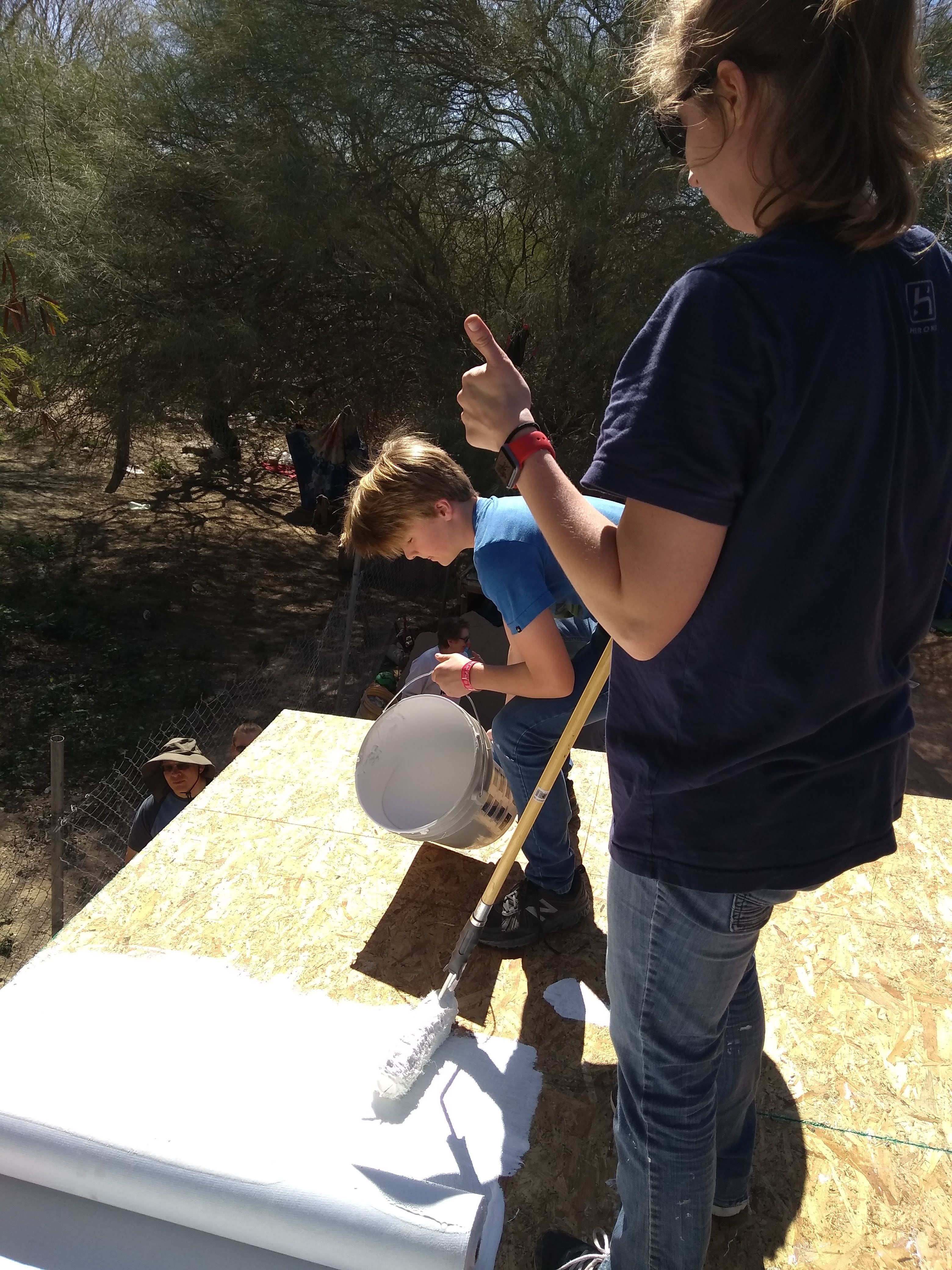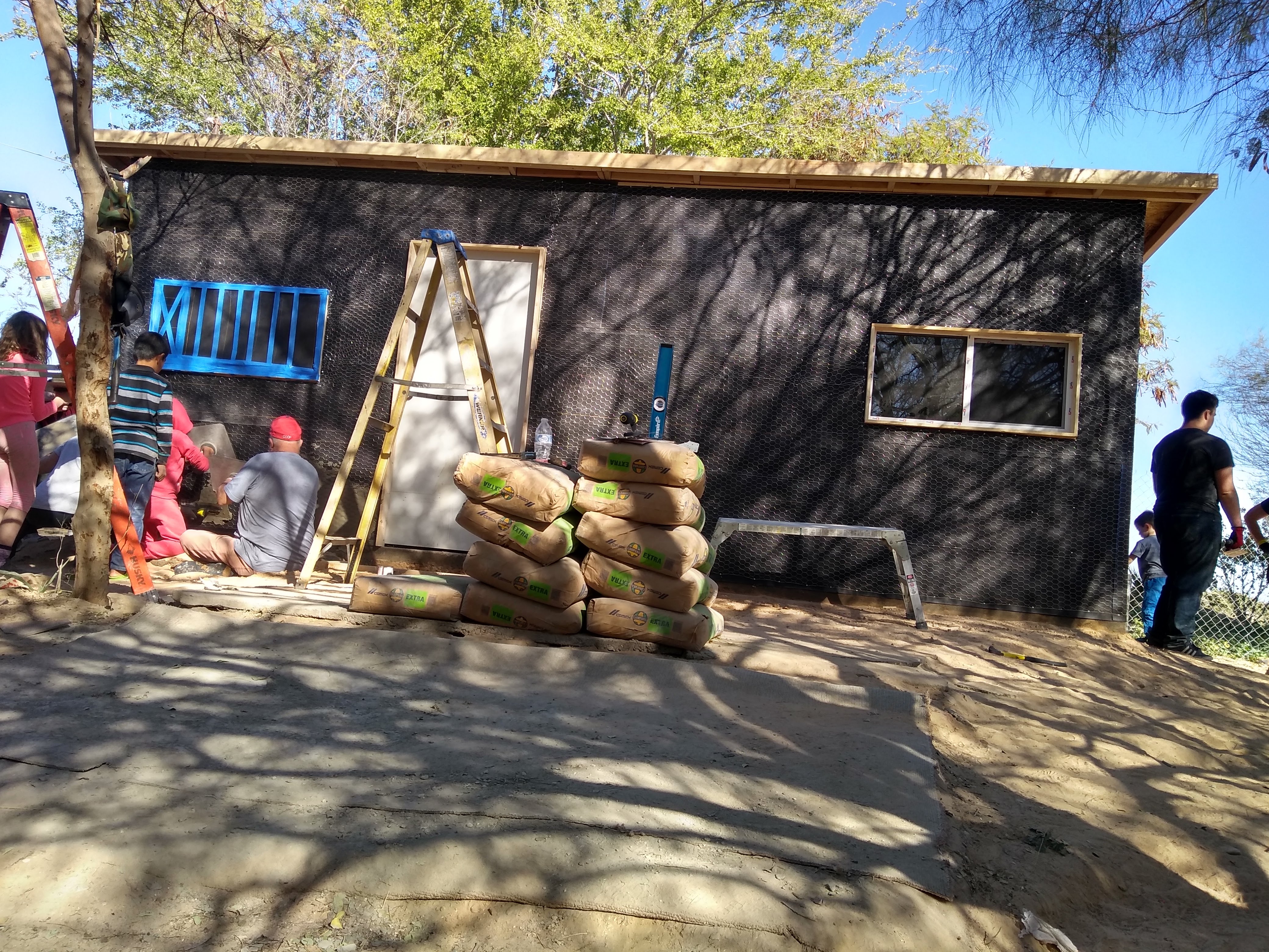 We broke camp, ate breakfast, drank coffee, prayed, and headed to the work site one last time. Today the only thing left to do was a final coat of roofing paint and a final coat of stucco. Well, we also made a stoop for the door and put up curtains in the windows.