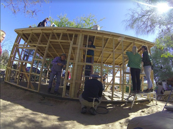 Day 2 is site prep day, foundation pouring day, wall building and roofing panel building day. No power tools are used in these builds, so cement for the foundation gets mixed in wheelbarrows by the hardworking “cement-heads,” then wheeled over to the foundation form for tamping and screeding. While all that is being done, another set of workers start sawing 2×4’s and fitting them together to form walls and roofing panels using hammers and nails.